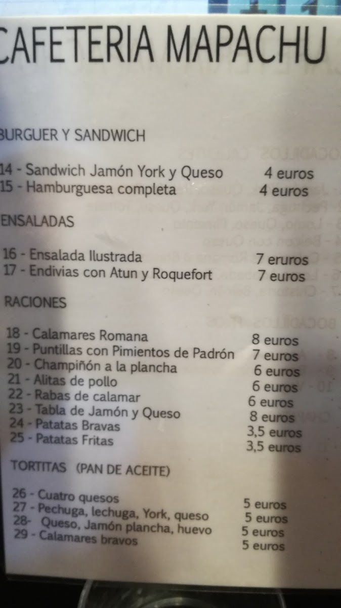 Menu items are organized mainly into savory dishes and light bites, along with a range of beverages including coffee and other drinks typically served in a cafe setting. The food options include salads, various tapas, meat dishes, and seafood, reflecting a balance of lighter and more substantial meals.